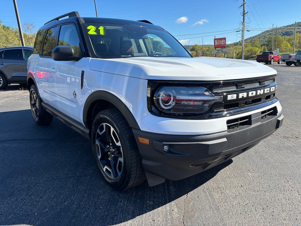 Oxford White 2021 Ford Bronco Sport Outer Banks 4WD 8-Speed Automatic 1.5L EcoBoost Local Trade, AM/FM radio: SiriusXM, Equipment Group 300A, Evasive Steering Assist, Ford Co-Pilot360 Assist+, Front Bucket Seats, Heated front seats, Heated steering wheel, Intelligent Adaptive Cruise Control w/Stop & Go, Leather Trimmed Heated Sport Contour Bucket Seats, SYNC 3 Communications & Entertainment System, SYNC 3/Apple CarPlay/Android Auto, Voice-Activated Touchscreen Navigation System, Wheels: 18" Ebony Black-Painted Aluminum.